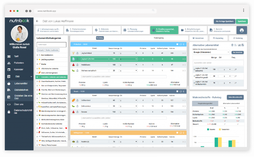 Nutribook verfügt über eine umfangreiche Lebensmitteldatenbank, die Sie mit eigenen Lebensmitteln erweitern können, sowie über eine Vorlagenbibliothek mit fertigen Ernährungsplänen als praktische Ausgangsbasis.